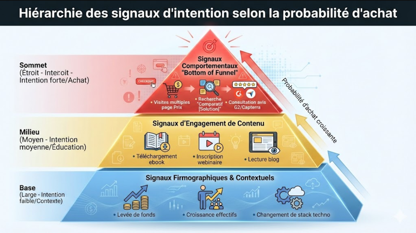 Dans une stratégie de marketing B2B basé sur l’intention, ces signaux te permettent de comprendre trois choses essentielles :